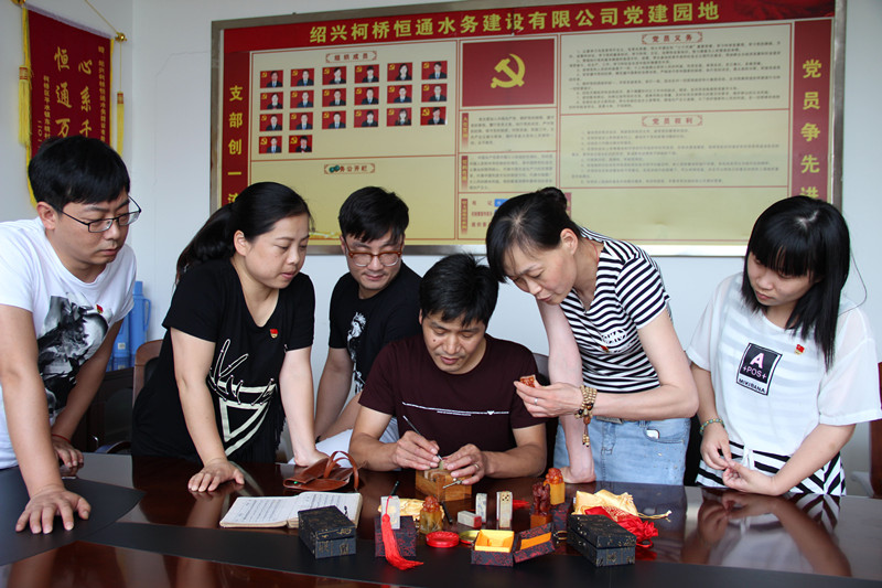 為進一步推進兩學一做學習教育,日前,恒通水務建設公司黨支部組織黨員以黨在人民心中為主題進行書法、篆刻創(chuàng)作,廣泛地吸引了黨員干部參與。圖為公司職工金偉勇在向黨員們傳授篆刻的竅門。